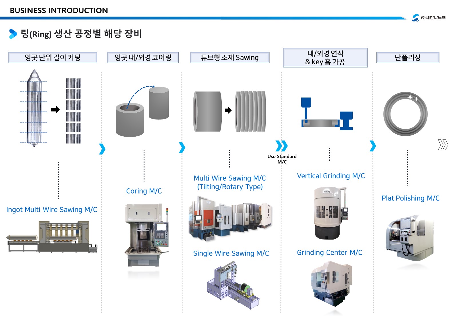 (주)새한나노텍은 반도체 전공정 중 "식각공정"에 사용되는 파인세라믹 부품 가공 전용 장비를 제조합니다. 실리콘, 쿼츠, 알루미나 등 난삭재를 효율적이고 우수한 품질로 가공할 수 있습니다. 독자적인 연구개발과 국책과제를 수행하면서 특허를 다수 보유하고 있으며, 업계를 선도하는 뛰어난 가공 기술을 선보이고 있습니다.